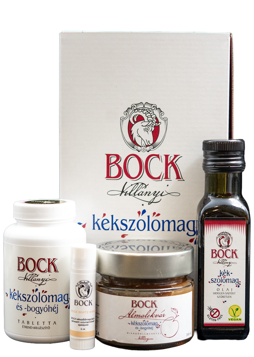 (HU) Lepje meg Magát vagy szeretteit Bock Kékszőlőmagos kényeztető csomaggal, amely segít bőrünk ápolásában és regenerálásában. A csomagba kerül kis Bock Kékszőlőmag Olaj, Bock Kékszőlőmag Tabletta, Bock Kékszőlőmagos Almalekvár és egy Bock Ajakápoló.